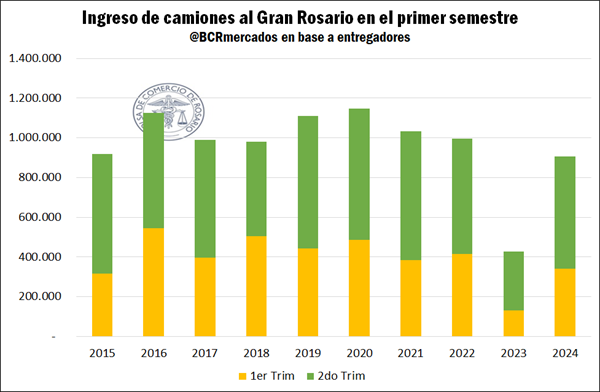El nodo del Gran Rosario es la principal vía de salida de los productos agroindustriales argentinos y uno de los principales a nivel mundial. Durante el primer semestre de este año se registró un ingreso aproximadamente de 900.000 camiones, este valor supera al semestre del año anterior, pero ocupa el segundo puesto de ingresos más bajos de la década. De todas maneras, cabe recalcar que esto se explica por el magro volumen ingresado en el primer trimestre del año en relación con años previos, dado que en el segundo trimestre el arribo de camiones al Gran Rosario estuvo en línea con años previos.