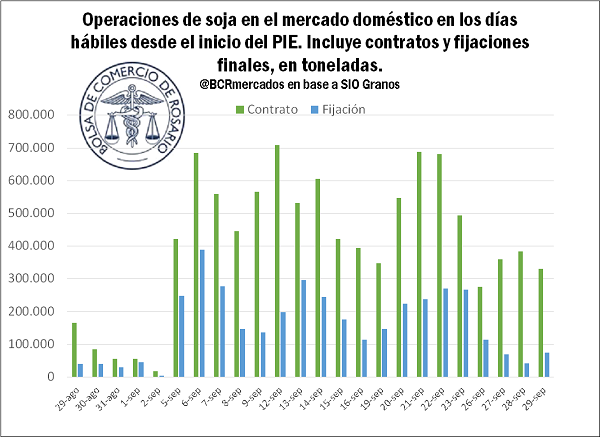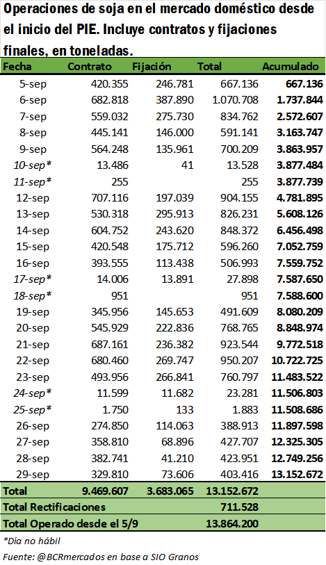 Frente a ello, se observa en el mercado interno una aceleración de las ventas de soja. De acuerdo con lo registrado en SIO Granos entre el 05 y el 29 de septiembre, se hicieron negocios finales por un total 13.864.200 de toneladas, de las cuales 10,17 millones corresponden a contratos nuevos, y 3,69 a operaciones de fijación de precios. Se excluye del cómputo del volumen de operaciones las anulaciones y las anulaciones de fijación, y se consideran sólo las transacciones “finales”.