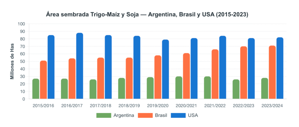 El crecimiento de la superficie también refleja realidades dispares. Mientras EE.UU. mantiene estable su área agrícola desde hace una década, Brasil expandió un 41% su frontera productiva gracias a la incorporación de los Cerrados del nordeste. Argentina, en cambio, solo creció un 8%, limitada por restricciones internas.
