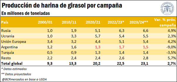 En cuanto a la producción de harina de girasol, Argentina nuevamente se destaca entre los principales productores del mundo, sólo por detrás de Rusia, Ucrania y la Unión Europea, en tanto en quinto puesto se encuentra Turquía. Estos cinco principales productores, en conjunto, concentran el 88% de la producción mundial, mientras que Argentina se destaca con una participación del 7%.