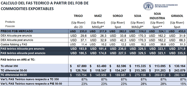 Para analizar el impacto de estas medidas sobre el mercado de granos, se ha supuesto en el cuadro adjunto que muestra el impacto de las medidas adoptadas sobre el FAS Teórico una variación de alícuotas de DEX del 15% para todos los productos, excepto complejo soja que permanecería sin cambios, aunque este punto aún no fue oficializado y circulan diversas versiones.