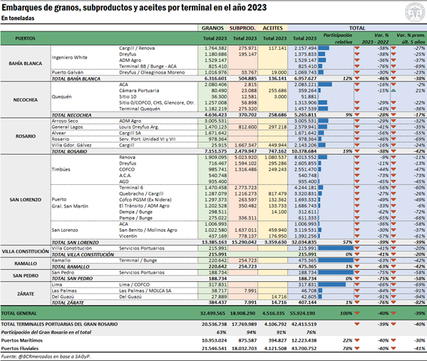 Durante el transcurso del 2023 se embarcaron desde los puertos de nuestro país un total de 55,9 Mt de granos, subproductos y aceites vegetales. Esto implica que se despacharon 37,6 Mt menos que en 2022 y 44,5 Mt menos que el récord que se alcanzó en 2019, cuando se embarcaron 100,5 Mt de productos agroindustriales desde los puertos argentinos.
