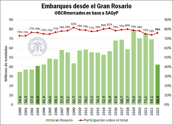 Considerando los embarques de granos, subproductos y aceites, las terminales del Gran Rosario despacharon 42,4 Mt en 2023 (↓39% vs. 2022), el volumen más bajo desde 2003. No obstante, este guarismo representa el 76% del total embarcado en el año, por lo que estos puertos han conservado su papel de liderazgo en exportaciones agroalimentarias. La zona de los puertos de San Lorenzo, que incluye las localidades de Timbúes, Puerto Gral. San Martin y San Lorenzo, representó el 57% del total despachado desde los puertos del país, mientras que la zona de Rosario, que comprende a las terminales de Arroyo Seco, General Lagos, Alvear, Rosario y Villa Gobernador Gálvez, dio cuenta del 19%.