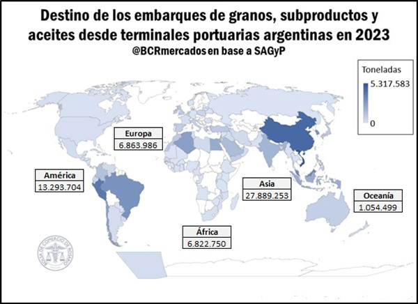 Tomando en cuenta los embarques de granos, subproductos y aceites, se advierte que la mitad (50%) tuvo como destino el continente asiático durante 2023. Luego, en orden decreciente en importancia, le siguieron América (24%), Europa (12%), África (12%) y, por último, Oceanía (2%).