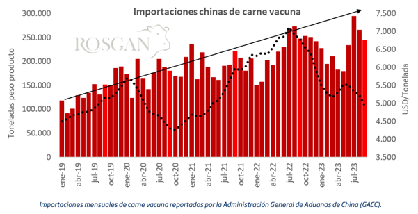 En lo que va de este año, según datos publicados por la misma Aduana china, las compras de carne vacuna en el exterior ascienden a 2,035 millones de toneladas, lo que marca un nuevo récord en compras, superando en un 5% el volumen importado en igual período de 2022. Sin embargo, en materia de precios, el dato de septiembre (USD 4.924 por tonelada) se ubica un 27,5% por debajo de los valores registrados un año atrás, solo superado por los pisos alcanzados a finales de 2020 en plena pandemia.