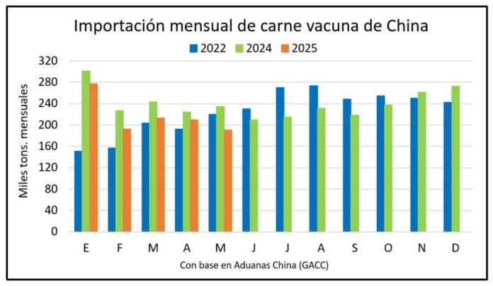 China importó 190 mil toneladas de carne vacuna en mayo, 17% menos que las 234 mil del mismo mes de 2024.