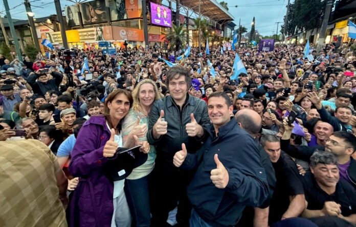 Lo acompañan candidatos locales del partido libertario, mientras que en las inmediaciones se movilizó también un grupo de militantes de partidos de izquierda para protestar contra la presencia del mandatario.