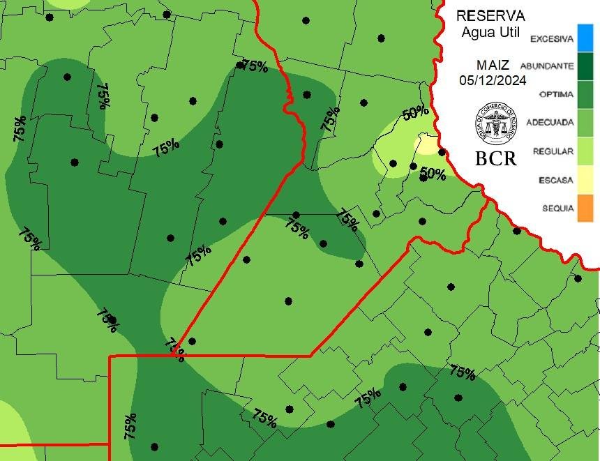 Los productores aseguran que, gracias a las lluvias de octubre y noviembre —especialmente donde llovieron más de 60 mm en los últimos 10 días— “el maíz está hecho” y tendría casi asegurado buenos rendimientos. En el mapa de reservas de agua útil para el maíz (1er metro del suelo) muestra que el 21% del maíz de la región núcleo dispone reservas óptimas.