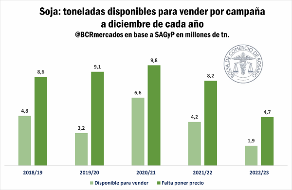 Partiendo de estimaciones propias de esta bolsa, la cosecha de soja para la campaña en curso no pasaría las 20 Mt. Teniendo en cuenta que a la última semana de noviembre la comercialización asciende a 16,5 Mt, más lo que se utilice como semillas y otros fines, las toneladas disponibles para comprometer, de aquí a la incursión del nuevo ciclo, es de 1,9 Mt, cuando en promedio, para los últimos cuatro meses de campaña, aún quedaban disponibles para vender casi 5 Mt.