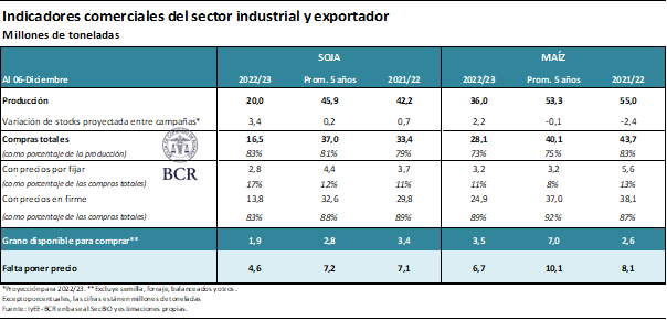 En el caso del maíz, diciembre comienza con una disponibilidad de grano para comprar por parte de la industria y la exportación (ello es, sin contar asignaciones para semilla, forraje y otros) por 3,5 Mt, por encima del año pasado, aunque es casi la mitad del promedio del último lustro. Además, hay 6,7 Mt de maíz sin precio firme.