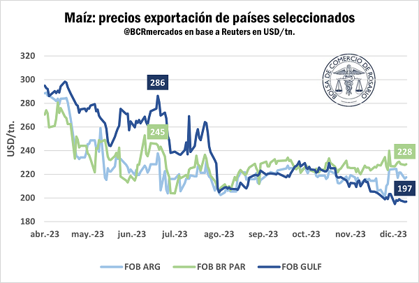 En solo dos ruedas hábiles, los pasados viernes y lunes, se anotaron 3,1 Mt de ventas al exterior de maíz, de las cuales 2,9 Mt corresponden a la próxima campaña 2023/24. En un par de días, se registraron el 12% del total de DJVE de maíz registradas en el año; sin ir más lejos, casi el 30% de las registraciones de maíz nuevo hasta ahora se efectivizaron entre el 7 y 11 de diciembre.
