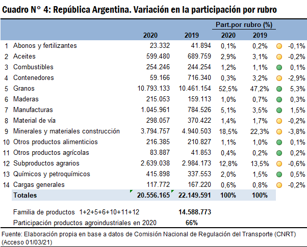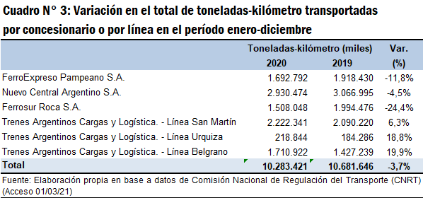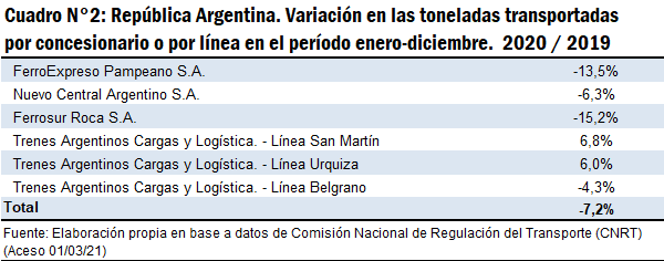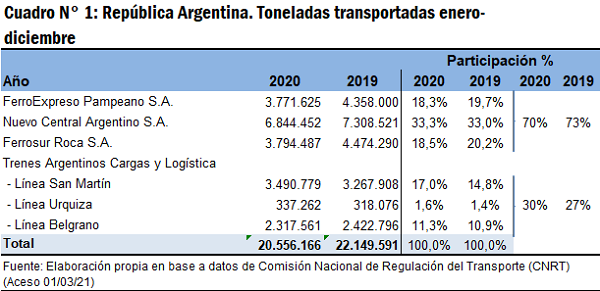 De acuerdo con la información que publica la Comisión Nacional de Regulación del Transporte (CNRT), la carga total transportada por ferrocarril en Argentina en el año 2020 disminuyó con relación a igual período del año anterior en un 7,2%, en tanto que las toneladas-kilómetro registraron caída del 3,7%.