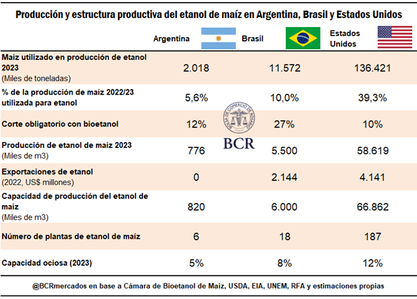 En este contexto, como fue planteado en el último Especial Maíz de la BCR, se vuelve sobre dos casos interesantes para pensar y profundizar la industrialización del maíz a través del bioetanol: Brasil y Estados Unidos. Entre ambos ostentan cerca del 80% de la producción global de etanol. Medidos con relación a su cosecha 2022/23, Brasil industrializa casi el doble de su producción de maíz respecto a Argentina, mientras que Estados Unidos procesa seis veces más maíz comparado con nuestro país.