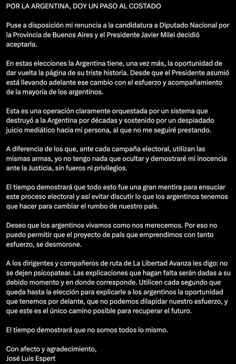 Deseo que los argentinos vivamos como nos merecemos. Por eso no puedo permitir que el proyecto de país que emprendimos con tanto esfuerzo, se desmorone. A los dirigentes y compañeros de ruta de La Libertad Avanza les digo: no se dejen psicopatear. Las explicaciones que hagan falta serán dadas a su debido momento y en donde corresponde.