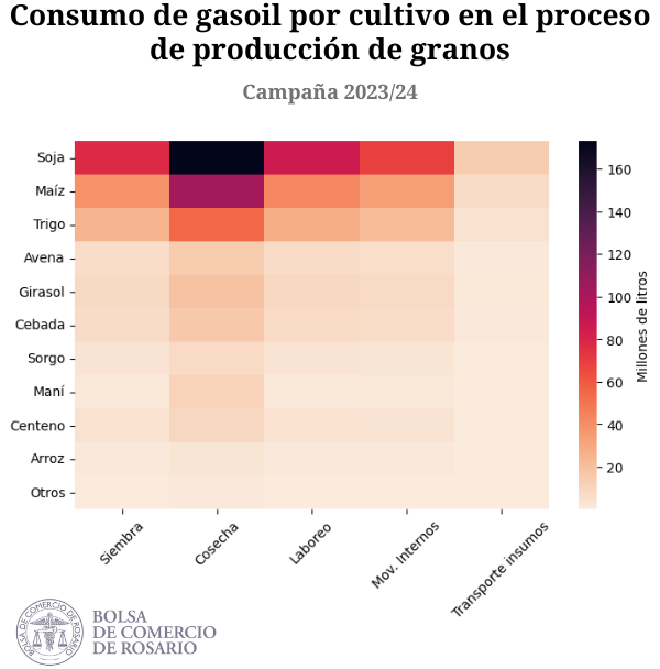 De este modo, el consumo de gasoil en el proceso productivo para la campaña 2023/24 podría ubicarse en 967 millones de litros, prácticamente sin cambios con respecto al consumo del ciclo 2022/23, dado que la superficie sembrada total a nivel nacional se mantuvo muy parecida.