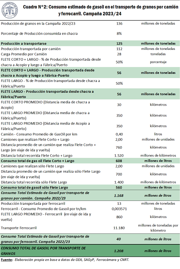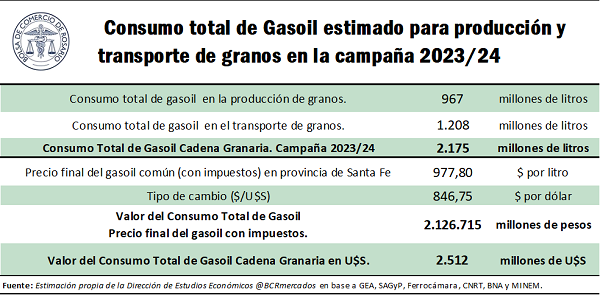 Del modelo se llega a la estimación de que el transporte de granos consumiría en la campaña 2023/2024 unos 1.208 millones de litros de gasoil. El 97% de dicho consumo sería realizado por camiones, mientras que el 3% restante se haría mediante el transporte ferroviario. Si se compara con la campaña anterior, caracterizada por la devastadora sequía, el consumo de gasoil para transporte de granos en el ciclo actual aumentaría un 69% interanual.