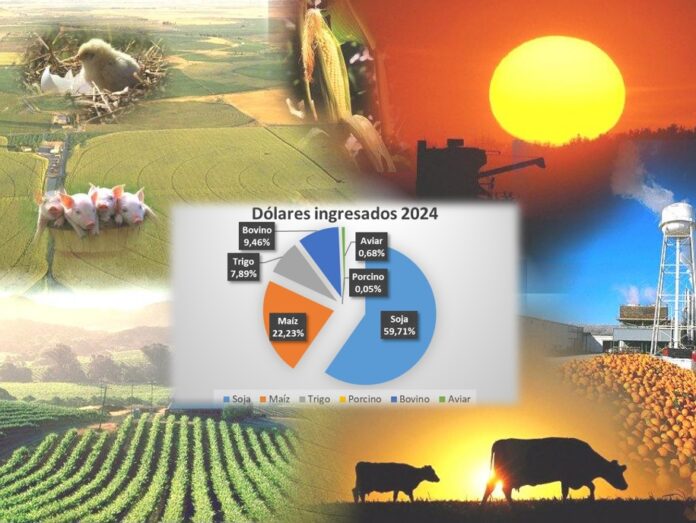 La porción de carne bovina paso de aportar 4,9% de dólares en 2014 a casi 9,5% en 2024, mientras las porciones de carne porcina y aviar se achicaron 0,06% a 0,05% y de 2,77% a 0,68% respectivamente. Así el aporte de dólares de las cadenas cárnicas al total pasó de 7,7% en 2014 a 10,2%.