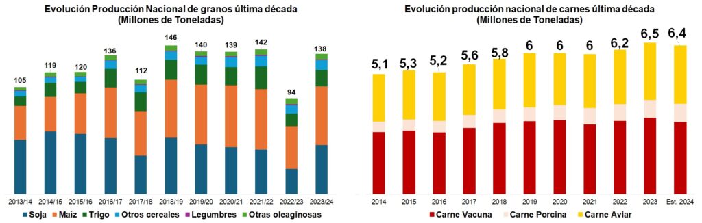 Los volúmenes exportados de granos y subproductos (harinas y aceites) de los complejos de soja, maíz y trigo (expresados en millones de toneladas en el gráfico), han fluctuado en sintonía con las fluctuaciones productivas, siendo el 2023 el año de menor exportación, dada la fuerte sequía que redujo las cosechas drásticamente, así como el 2021 fue un año de exportaciones récord, con 90 millones de toneladas, año que coincide con cosecha récord de maíz y buen nivel de producción de soja y trigo.
