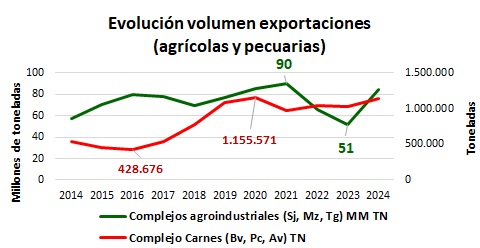 En cuanto a los volúmenes exportados de carnes (expresados en toneladas en el gráfico), se observan años de depresión entre 2015 y 2016, exportaciones récord en 2020, y crecimiento constante desde el 2022, levemente acelerado en 2024. Los cambios de coyuntura que condicionan las exportaciones de carnes, fueron condimentos muy importantes en el nivel de desarrollo de estas cadenas.