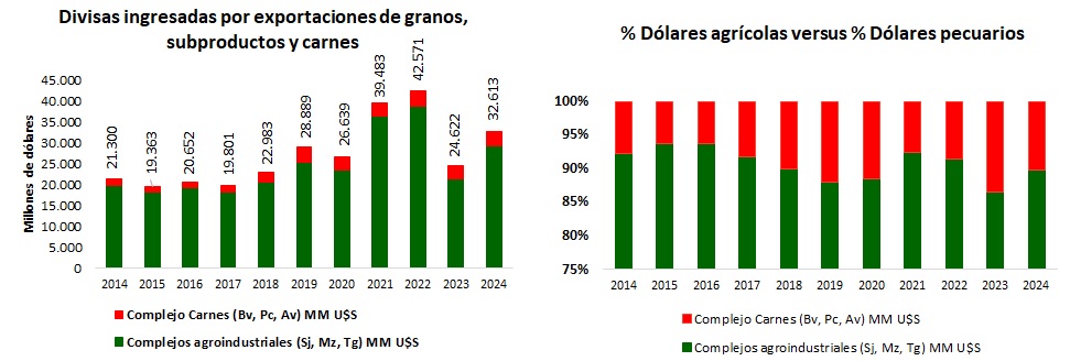 En los siguientes gráficos de torta puede verse el volumen exportado y dólares ingresados por granos y carnes en 2014 y 2024.