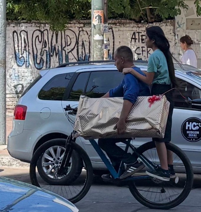 En este contexto, la imagen de un hombre que se viralizó en las redes sociales se convirtió en el símbolo perfecto del esfuerzo de miles de familias. En la foto, se lo ve haciendo equilibrio en su bicicleta para transportar un regalo de enormes dimensiones, envuelto en papel dorado y con un moño rojo, mientras su hija lo abraza por la espalda, compartiendo el viaje y la misión. La escena, capturada en una calle cualquiera, refleja el ingenio y la perseverancia para cumplir con el deseo de agasajar a la mamá, sin importar las dificultades.