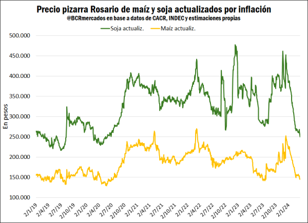Si centramos la atención en los últimos meses, desde mediados de diciembre de 2023 el precio disponible en pesos de la soja cayó 44% ajustada por inflación y arribando a un mínimo desde julio de 2020. En el caso del maíz, se vislumbra una situación similar con una caída de 42% en igual período y muy cerca de romper el menor valor de julio de 2023 que lo llevaría a un piso desde 2020. A comienzos de marzo mostramos un análisis similar y, desde entonces, la tendencia se ha profundizado hasta la actualidad.