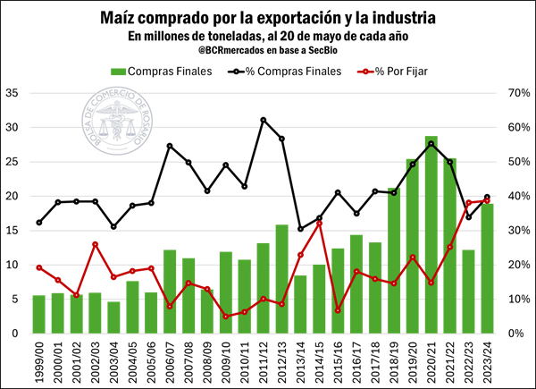 En el mercado local, la oferta continúa siendo muy acotada, y se restringe a las posiciones más cortas. De todos modos, el porcentaje de maíz ya vendido en relación con la producción total estimada alcanza el 40%, en línea con el 41% promedio de los últimos cinco años y por encima del 34% anotado a la misma altura del año anterior. Sin embargo, el porcentaje de las compras “a fijar”, a las que aún no se le ha puesto precio en firme, representa un máximo histórico del 39% de las operaciones a la fecha.
