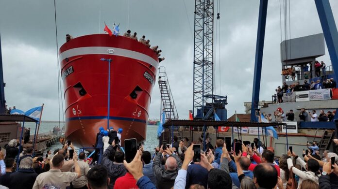 Participamos en la botadura del buque pesquero “Huafeng 827” junto a @juliandominguez y @KulfasM .Se trata de un barco fresquero con asiento en #MardelPlata que generará empleo local y fortalecerá al sector. Es la 1° entrega de 6 buques que serán renovados por #AstilleroContessi. pic.twitter.com/N17YzgwD6O