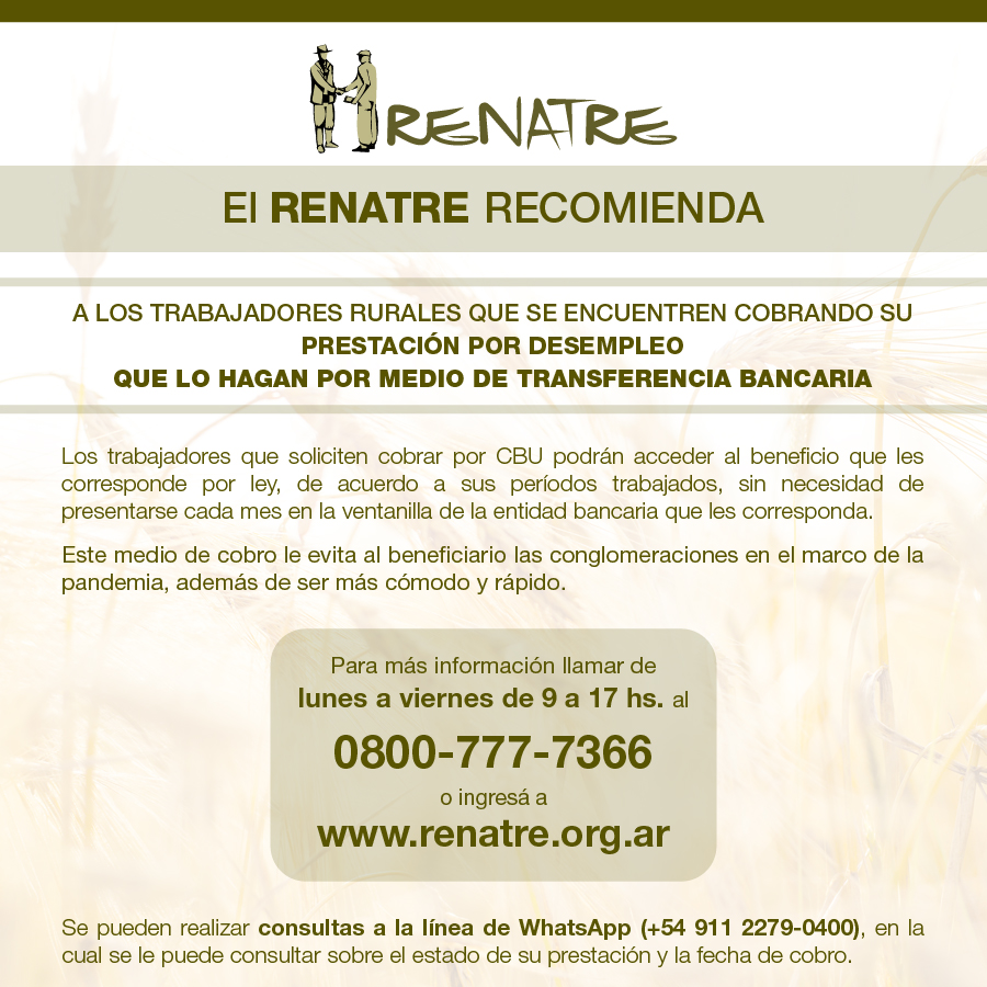El Registro Nacional de Trabajadores Rurales y Empleadores (RENATRE), recomienda a los trabajadores rurales beneficiarios de la Prestación por Desempleo que soliciten cobrar por CBU, ya que así podrán acceder al beneficio que les corresponde por ley, de acuerdo a sus períodos trabajados, sin necesidad de presentarse cada mes en la ventanilla de entidad bancaria que les corresponda.