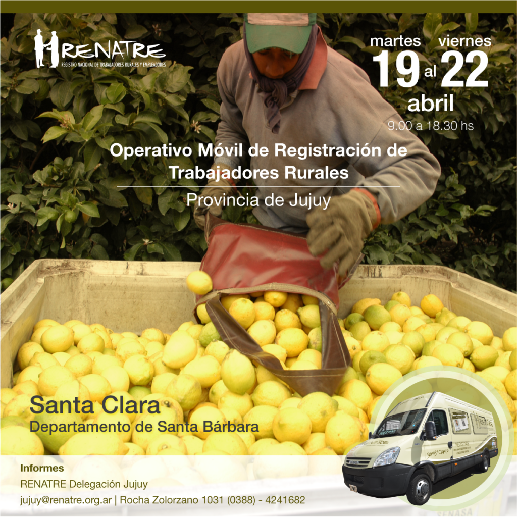 La Delegación del Registro Nacional de Trabajadores Rurales y Empleadores (RENATRE) en Jujuy, realizará un Operativo Móvil de Registración para trabajadores rurales dedicados a los cítricos, en la localidad de Santa Clara, entre el día 19 y 22 de abril.