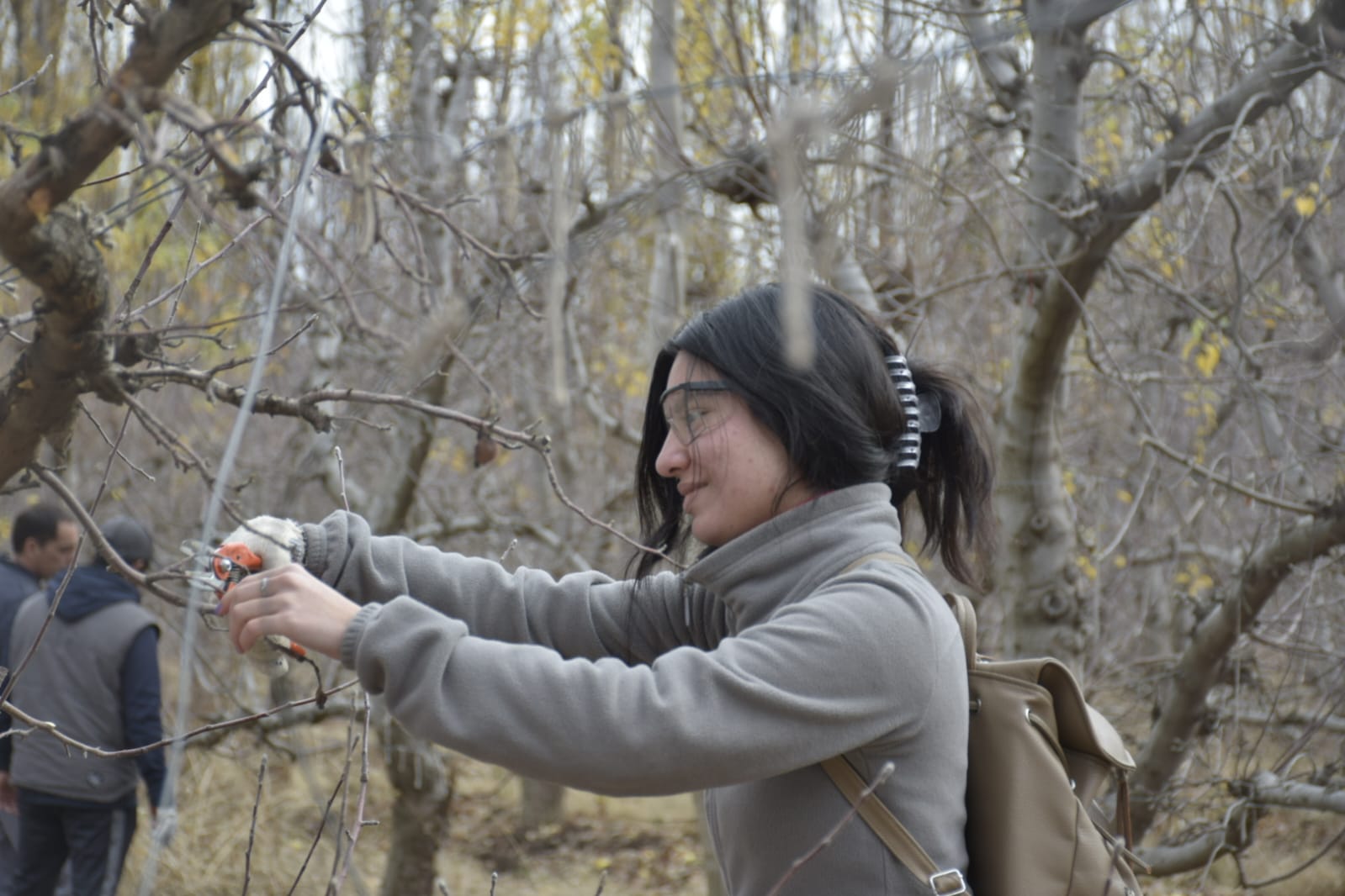 Durante la capacitación, los participantes pudieron aprender y mejorar sus técnicas en la poda de frutales y carozo a través de un enfoque teórico y práctico, dictado por el ingeniero Lautaro Aguilar del INTA.