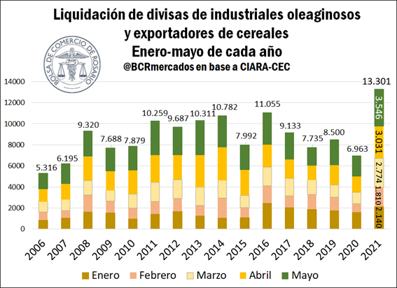 Los primeros cinco meses del año se alcanzaron liquidaciones de divisas por más de US$ 13.300 millones y el período enero-mayo 2021 se consolidó como el de mayor liquidación de divisas de la historia, según surge de datos informados por CIARA-CEC. Un panorama de precios muy favorecedor, acompañado de un leve repunte de los niveles de exportación del complejo soja, fueron de la partida para consolidar este ingreso de divisas.