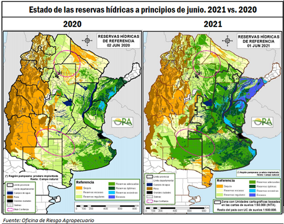 Hay algo que distingue a esta campaña de la anterior, y es que, al menos al puntapié inicial de las siembras, las condiciones se presentan prácticamente como inmejorables. Tal como se puede observar en la imagen que sigue, el estado de las reservas hídricas es de adecuado a óptimo en la mayor parte de las regiones productivas de nuestro país, con sólo algunas regiones puntuales presentando excesos y otras reservas regulares.