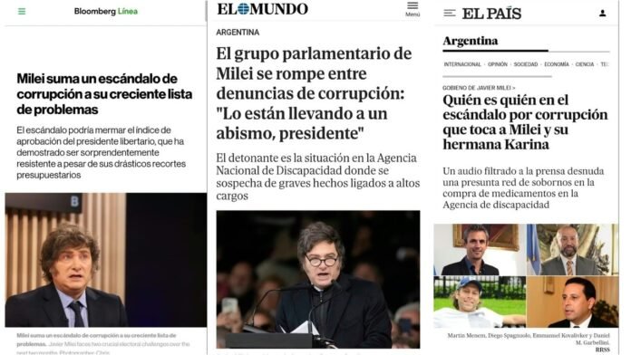 * Bloomberg Línea: Tituló que “Milei suma un escándalo de corrupción a su creciente lista de problemas”, y advirtió que el caso podría mermar el índice de aprobación del Presidente.