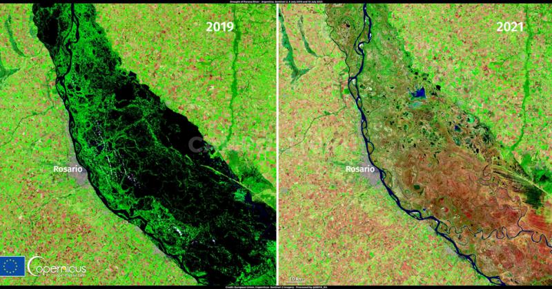 Para ello tomó dos imágenes de su satélite Copernicus, herramienta que forma parte del Programa de Observación de la Tierra de la Unión Europea. “Estas imágenes, adquiridas por uno de los satélites Copernicus Sentinel-2 el 6 de julio de 2019 y el 10 de julio de 2021, evidencian la sequía que afecta a la cuenca del río Paraná en Argentina”, indica en su sitio web.