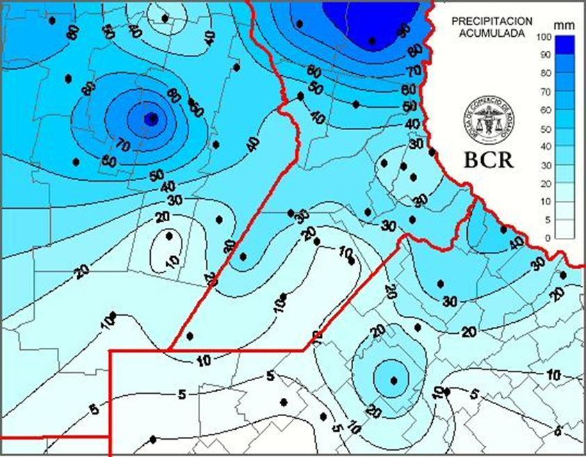 Los valores más elevados se registraron en Irigoyen, con 90,4 milímetros, e Idiazábal, con 82,2 milímetros. También se destacan Carlos Pellegrini, con 84,4 milímetros, y Colonia Almada, con 66 milímetros. En la localidad de Ramallo, en tanto, se registraron 46,6 milímetros. “Lo más importante quedó desde el centro de la región núcleo hacia el norte. Esta vez, las tormentas más importantes se observan por encima de la línea horizontal que cruza a Rosario”, señaló Russo.