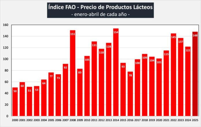 El índice de precios de los productos lácteos de la FAO comenzó el 2025 dentro de los valores más altos de los últimos 4 años.