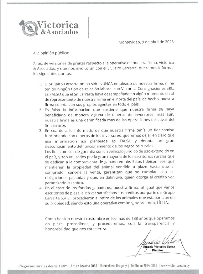 “El Sr. Jairo Larrarte no ha sido NUNCA empleado de nuestra firma, ni ha tenido ningún tipo de relación laboral con Victorica Consignaciones SRL”, e indica. “Es FALSO que el Sr. Larrarte haya desempeñado en algún momento el rol de representante de nuestra firma en el norte del país, de hecho, nuestra firma cuenta con sus propios agentes en todo el país”.