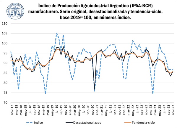 En el penúltimo mes del 2023, la actividad de la agroindustria nacional medida por el índice de producción agroindustrial (IPAA BCR) manufacturero que estima la Bolsa de Comercio de Rosario registró un repunte del 2,9% respecto al mes inmediatamente anterior. Este guarismo rompe con la tendencia descendente que se venía registrando desde mayo del presente año, aunque si comparamos con igual mes del año anterior, la actividad se sitúa casi 11,6% por debajo.