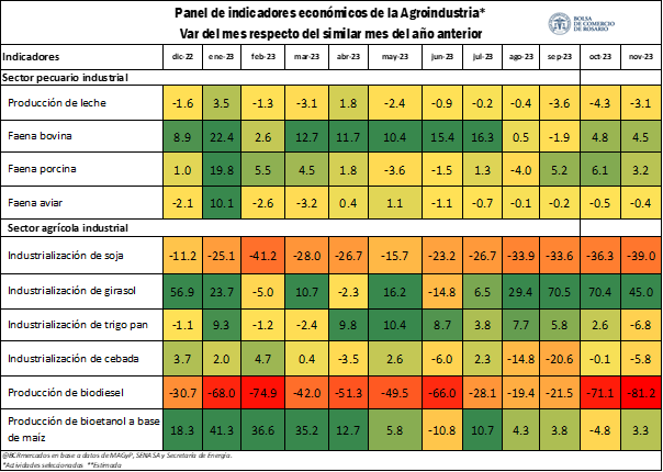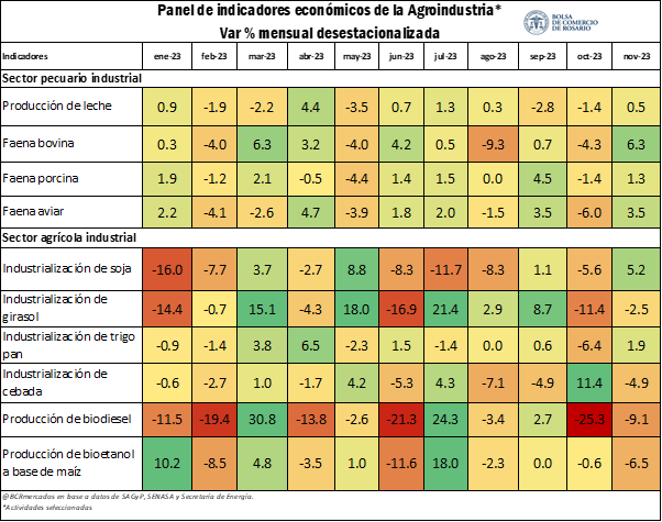 En cuanto al sector agrícola industrial, en noviembre el principal incremento mensual se registró en la industrialización de soja, con un incremento mes a mes del 5,2% desestacionalizado. Además, junto con la industrialización de trigo pan (1,9%) fueron los únicos sectores en exhibir una variación positiva. En contraposición, la industrialización de cebada y girasol registraron caídas del 4,9% y 2,5%, respectivamente. En el mismo sentido, la producción de biocombustibles se ubicó en terreno negativo, con biodiesel cayendo 9,1% y bioetanol a base de maíz 6,5%.