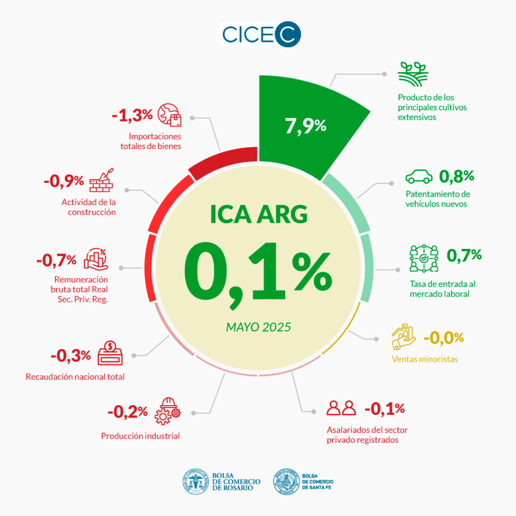 Según un reciente informe del Centro de Investigación del Ciclo Económico (CICEc), integrado por las Bolsas de Comercio de Rosario y Santa Fe, el Índice Compuesto Coincidente de Actividad Económica de Argentina (ICA-ARG) presentó en mayo de 2025 una variación mensual positiva del 0,1%. En la comparación interanual, el indicador mostró un incremento del 6%, aunque se mantiene la tendencia hacia un ritmo de recuperación más lento.