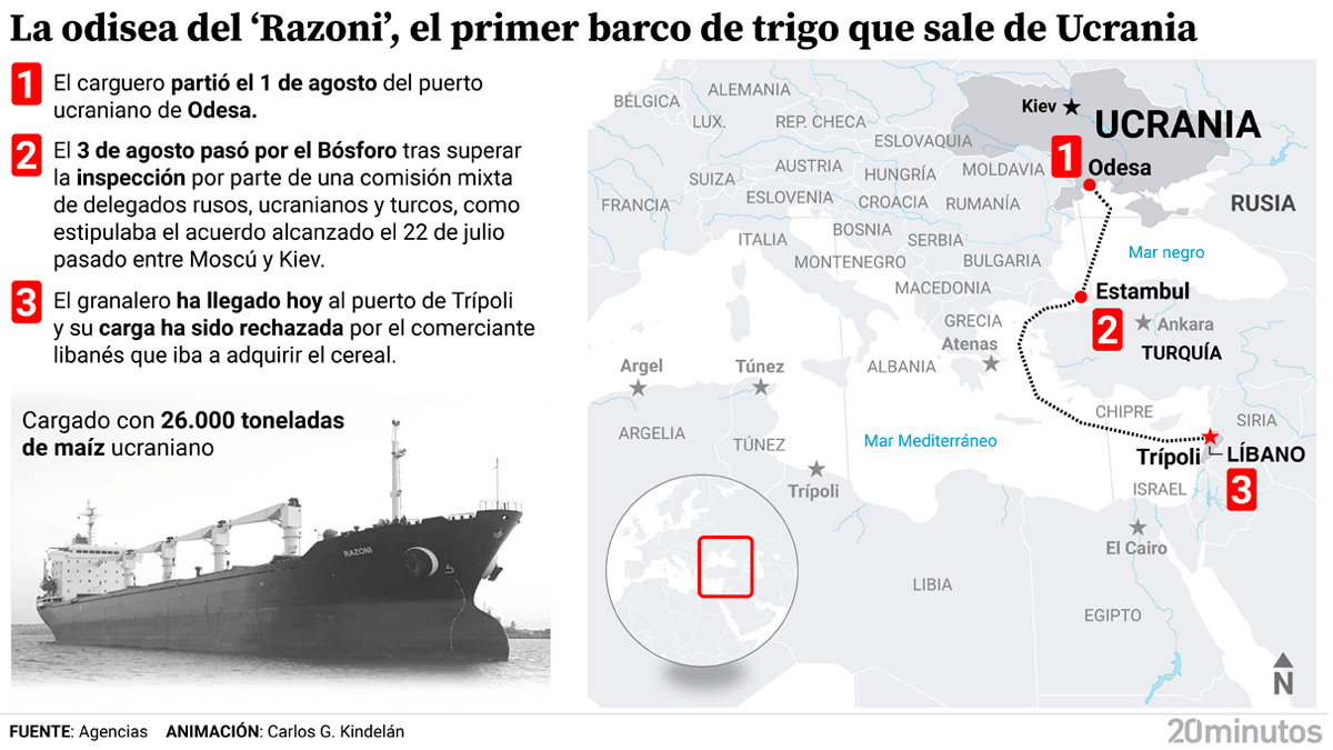 El “Razoni”, un granelero con bandera de Sierra Leona, partió el 1 de agosto del puerto ucraniano de Odesa y dos días después pasó por el Bósforo tras superar la inspección por parte de una comisión mixta de delegados rusos, ucranianos y turcos, como estipulaba el acuerdo alcanzado el 22 de julio pasado entre Moscú y Kiev.