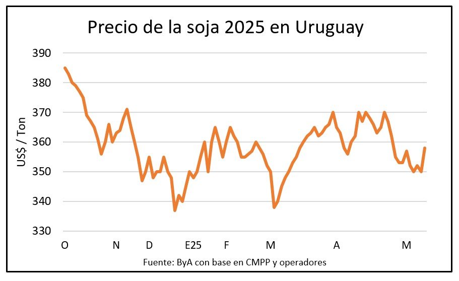 En Uruguay la oleaginosa repuntó desde la franja de US$ 350 a US$ 353 de la semana pasada y se acercó a los US$ 360, sus cambios en las primas que están arriba de US$ 30 por tonelada.