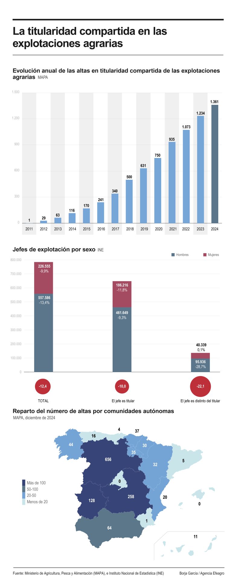 Su número ha ido creciendo desde que en 2011 se aprobó la Ley de titularidad compartida para profesionalizar la actividad agraria de las mujeres, pero su figura no termina de calar en el campo, por lo que el Gobierno tiene previsto modificar la norma con la próxima ley de agricultura familiar.