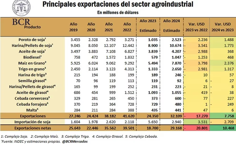 En base al trabajo realizado por la BCR, todos los complejos granarios presentarían alzas en sus exportaciones. El sojero sería el que mayor diferencia arrojaría, ya que se estipula que entre los despachos de poroto sin procesar, harinas y pellets, aceite y biodiésel alcanzaría los USD 18.451 millones, más de USD 4.100 millones respecto a lo estimado para 2023.
