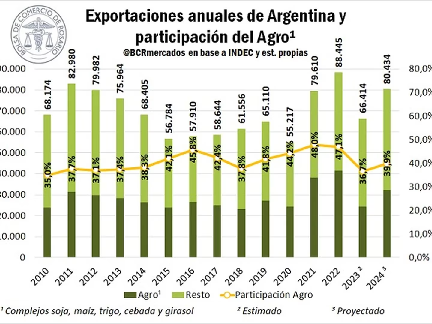Según un estudio de la Bolsa de Comercio de Rosario (BCR), las exportaciones de los principales complejos granarios podrían alcanzar los USD 32.109 millones en 2024 si se consideran las estimaciones actuales de intención de siembra, los rindes tendenciales para estimar producción y los precios FOB vigentes para embarque en el próximo año.