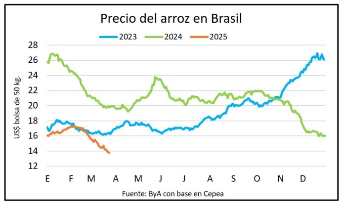 El arroz continúa ajustando a la baja en Brasil y en el mundo. Después de un año con precios excepcionalmente altos los valores actuales son los más bajos desde mayo de 2022 en el sur de Brasil, con un cierre a US$ 13,76 por bolsa este lunes, 12% menos que hace un mes.