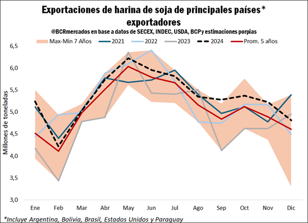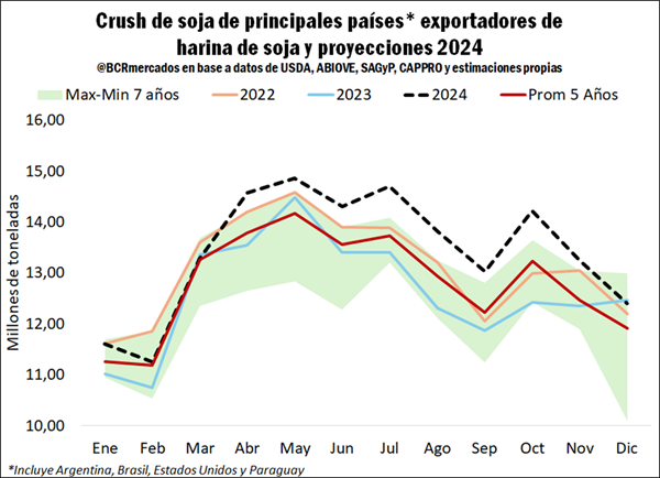 Al realizar un análisis estacional del crush esperado de los principales países exportadores de harina de soja, entre abril y mayo se alcanzaría el máximo anual en 2024 con un total cercano a 15 Mt y motorizado con el ingreso de la cosecha de Sudamérica. Hasta el primer trimestre de 2024, la molienda estaría en línea con el promedio de los últimos 5 años, pero a partir de abril se romperían récord mensuales de al menos los últimos 7 años.