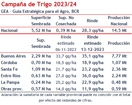 Los nuevos ajustes sobre el rinde promedio nacional lo ubican en 28,3 qq/ha, frente a 26,4 qq/ha estimados en noviembre. La nueva estimación tiene en cuenta una pequeña suba de área (20.000 ha más en Entre Ríos, SIBER), que llevan el total de área sembrada a 5,52 millones de ha y una pérdida de superficie que se mantiene en 390.000 ha.