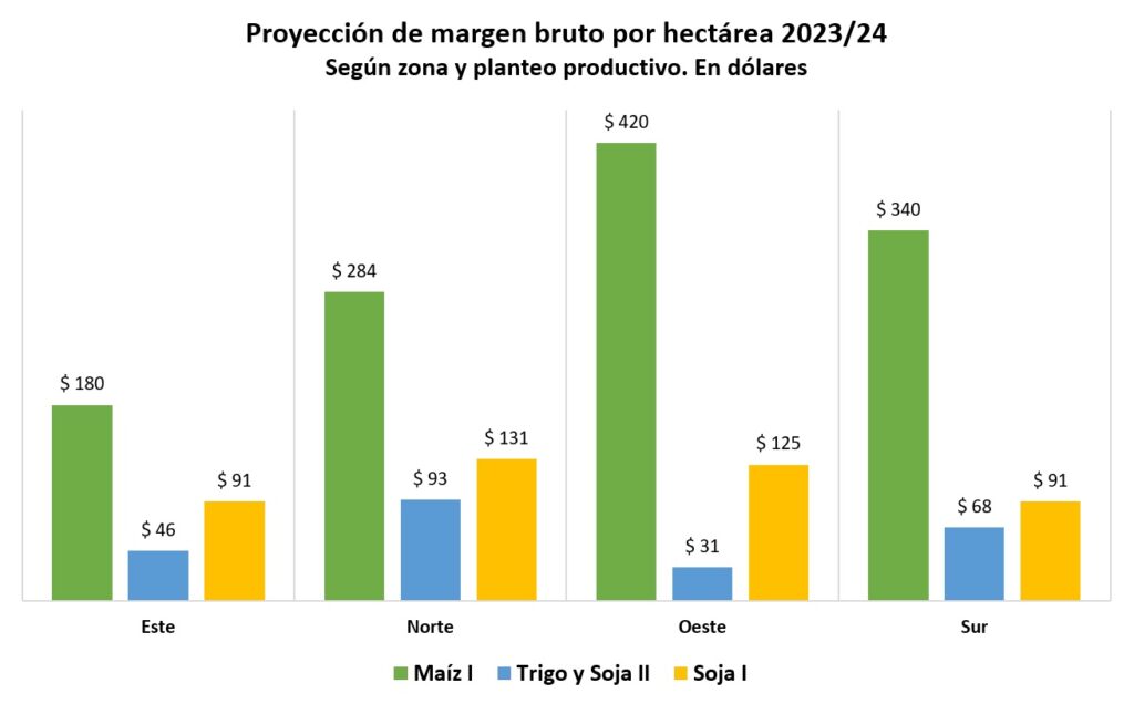 De esta manera, los rendimientos con los que se proyectan los márgenes son los rindes promedios de las campañas en las que predominó el efecto de El Niño en cada zona de la provincia: Este: Colón, Concordia, Federación y San Salvador Norte: Federal, Feliciano, La Paz y Villaguay Oeste: Diamante, Nogoyá, Paraná y Victoria Sur: Gualeguay, Gualeguaychú, Tala y Concepción del Uruguay En el caso del trigo, no se observa correlación entre el fenómeno y los rendimientos, ya que durante la época invernal las lluvias no difieren mucho del promedio histórico. Por lo tanto, el rendimiento considerado es el de las últimas 10 campañas, ajustado por el estado de condición del cultivo. Además, es importante recordar que el margen bruto por hectárea es el resultado de descontar los costos de comercialización, labores, insumos, cosecha y arrendamientos de los ingresos. No se tienen en cuenta los costos de estructura ni los impuestos. De este modo, los resultados obtenidos, que se pueden ver en la figura, muestran dos situaciones: El margen de maíz de primera es superior a todos los planteos en todas las zonas, lo cual se debe fundamentalmente a dos razones: los rendimientos promedio en años de El Niño se acercan a los 7.400 kg/ha en la zona Sur, 7.600 kg/ha en la zona Oeste y 7.100 kg/ha en la zona Norte y 6.500 kg/ha en la zona Este, muy superiores al promedio, como se detalla anteriormente. También, es importante tener en cuenta que en términos relativos (en relación con los costos), el planteo de soja de primera puede llegar a tener una mayor rentabilidad que el maíz en las zonas este y norte. El planteo trigo y soja de segunda en la zona Oeste se proyecta con el margen más bajo debido a la mala condición que presenta el trigo en dicha zona, rondando los 2.500 kg/ha, mientras que en un año promedio se acerca a los 3.000 kg/ha.